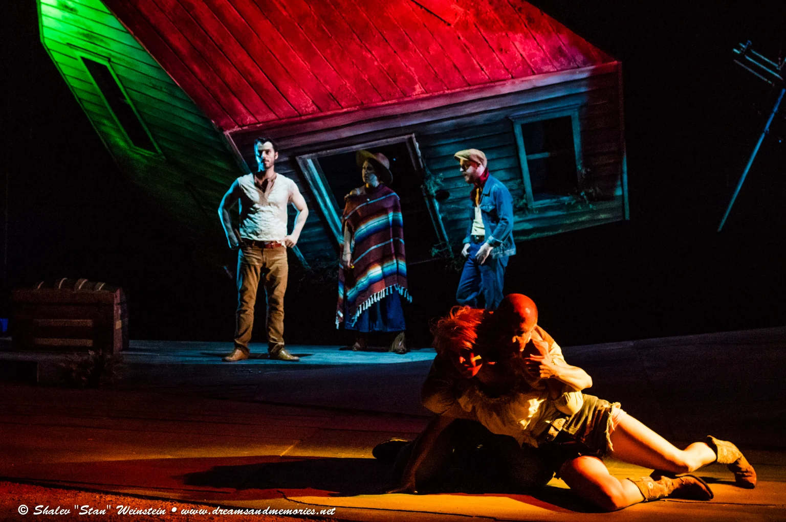 “The bizarre structure reflects whatever color of light shines upon its roof, red, yellow, or blue. Or it radiates glaring white from a naked lightbulb inside. Christopher Annas-Lee (recent winner of the Helen Hayes Lighting award for last season’s Yerma at GALA) provides the lighting design. We’re somewhere that’s nowhere near the Mexican border, called Jornado del Muerto, “route of the dead man,” an extremely dry 100-mile stretch of desert territory—a wasteland.”